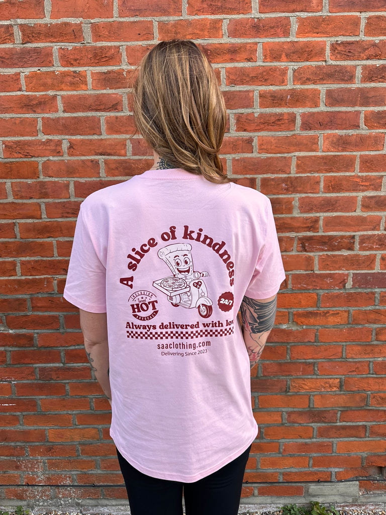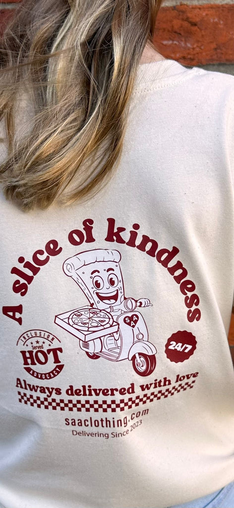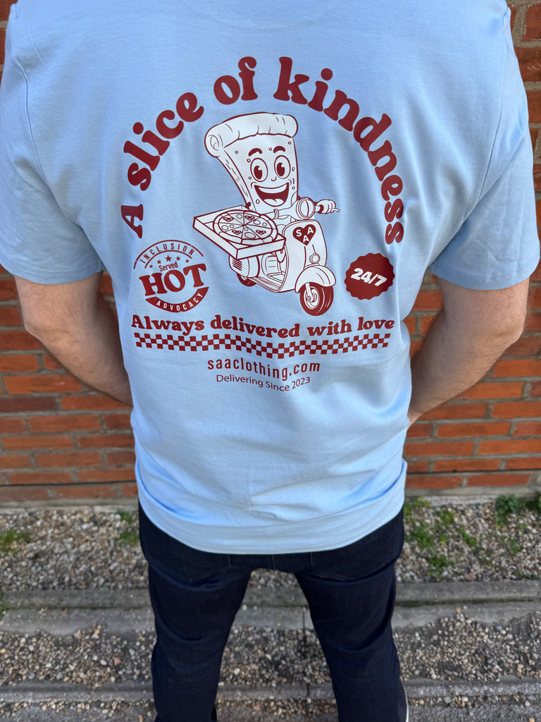Our Slice of Kindness T-Shirt is all about spreading positivity wherever you go. Featuring our cheerful cartoon pizza slice riding an SAA scooter, with the message “A slice of kindness - always delivered with love”, this design is a reminder that small acts of kindness can make a big difference.
