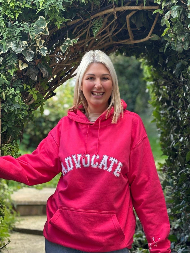 With the word “Advocate” in bold varsity print across the chest, this hoodie makes a strong statement. On the left sleeve near the cuff, you’ll find the empowering message “Keep going, never give up”—a nod to the dedication and perseverance of those who fight for inclusion and equality every day.