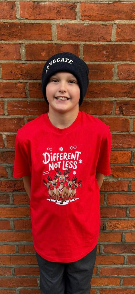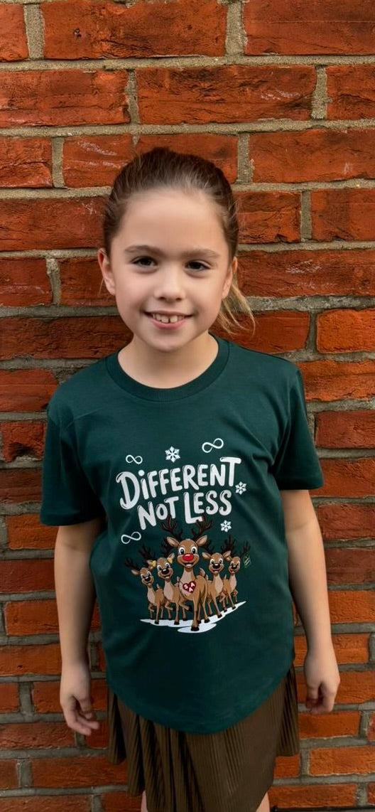 This Christmas, let your child proudly wear a message that celebrates their uniqueness. Our Different Not Less Kids Christmas T-shirt features Rudolph the red-nosed reindeer, who reminds us that being different is something to celebrate, not hide.