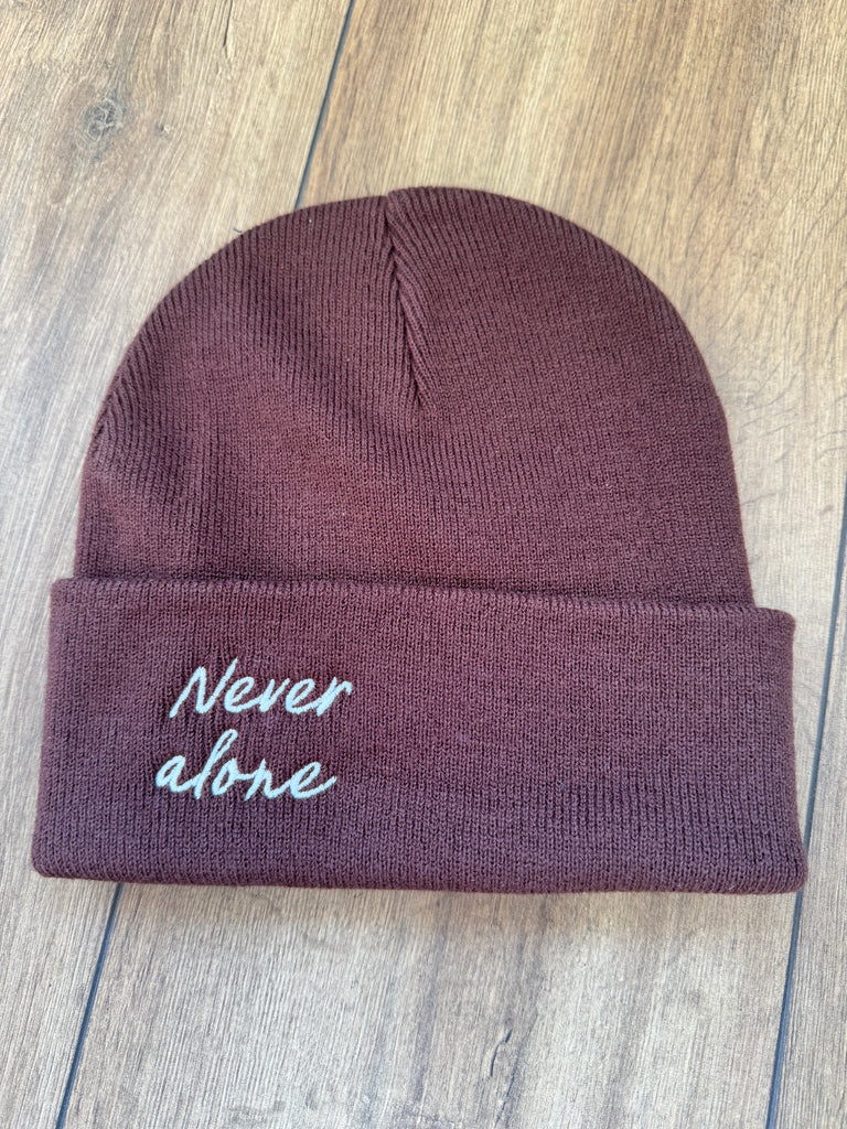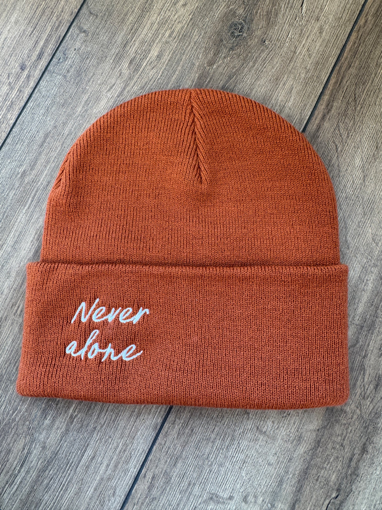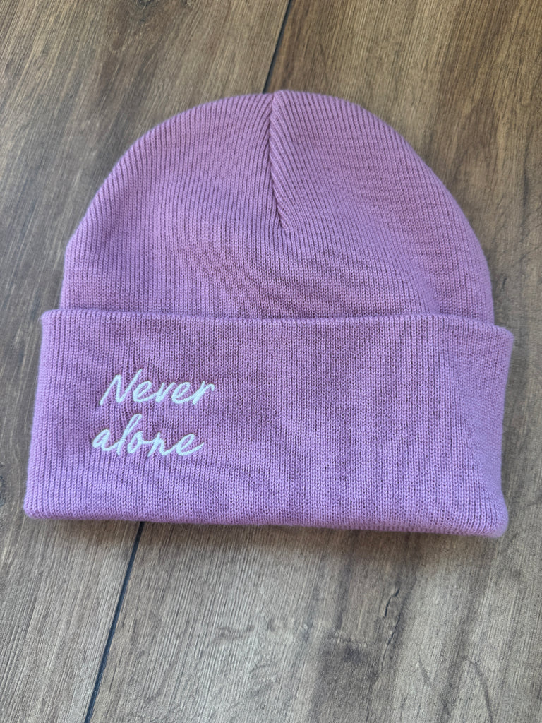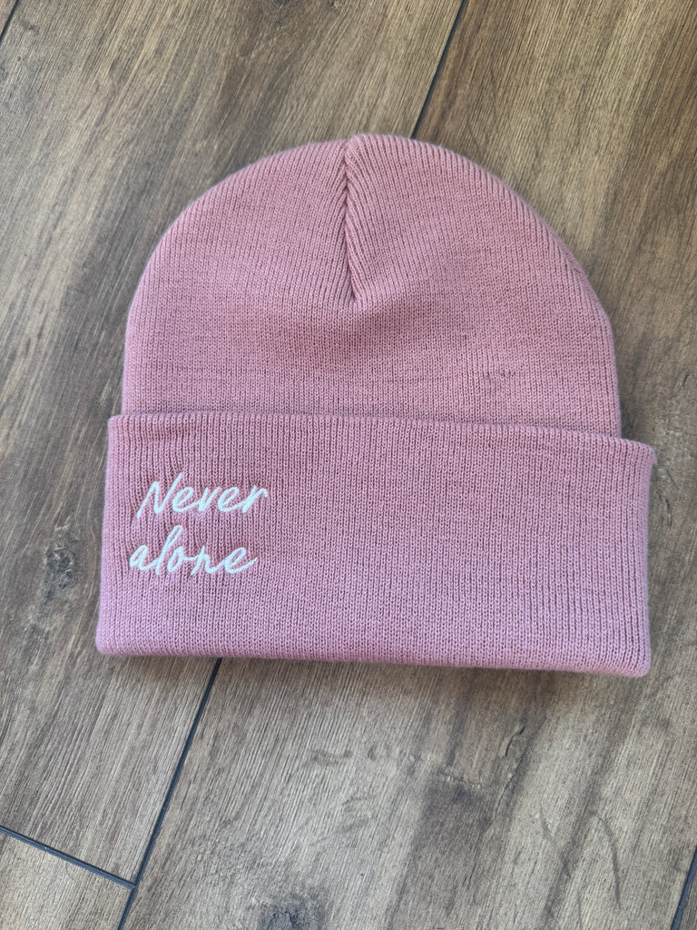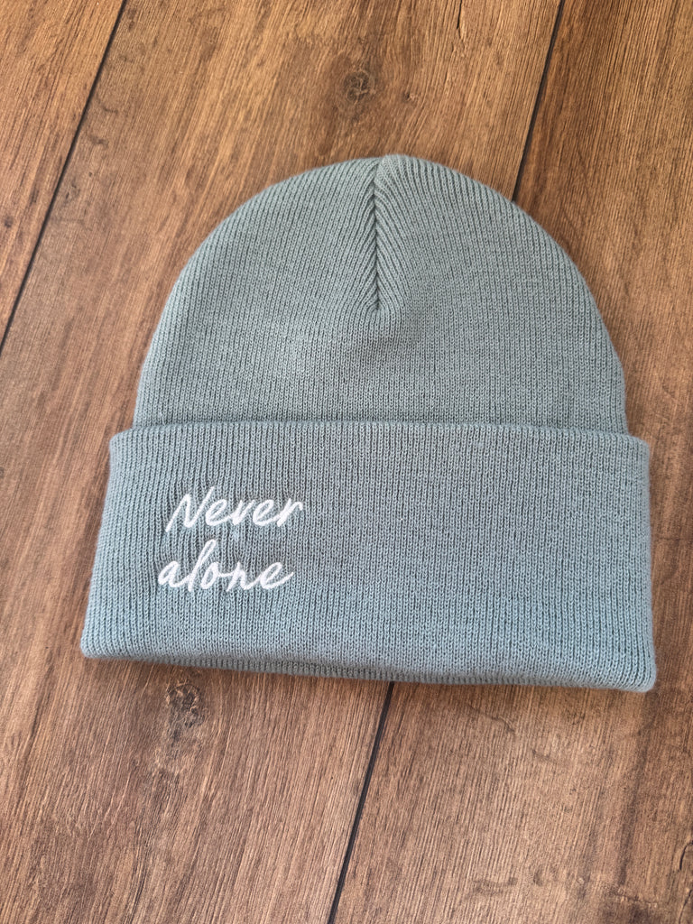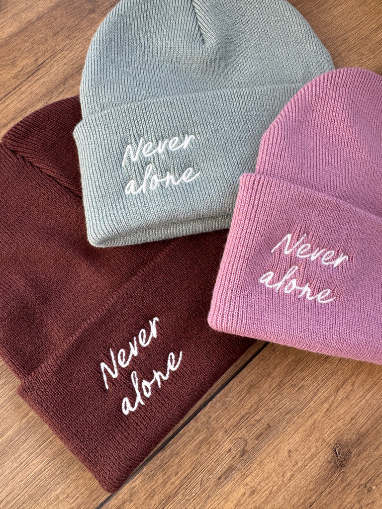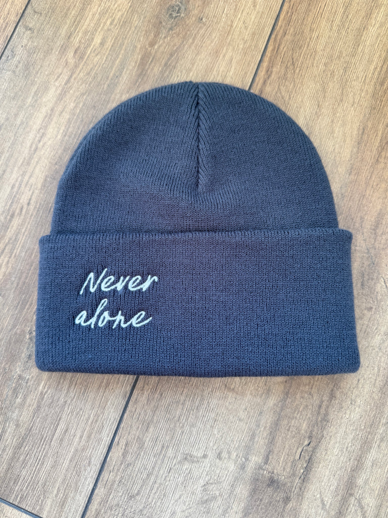 The Never Alone Beanie is a small way to share a big message, that together, we are never alone.