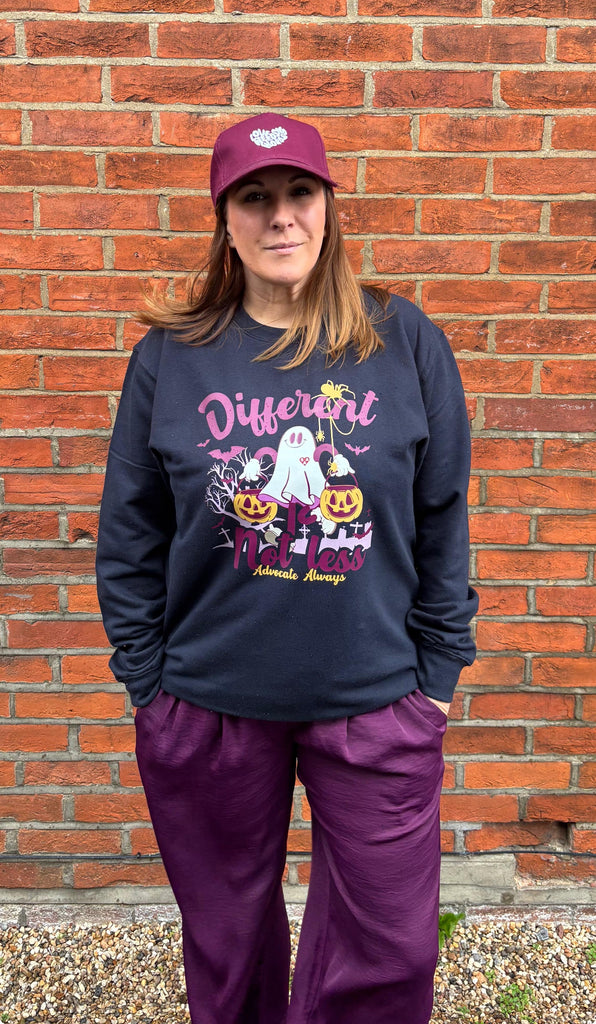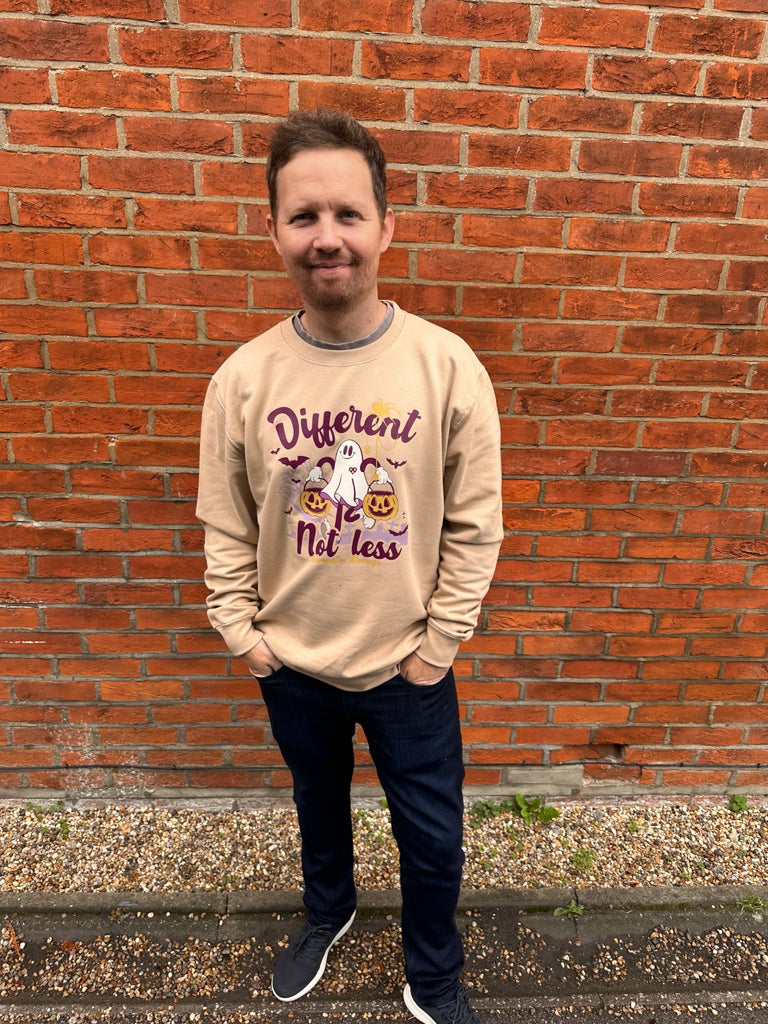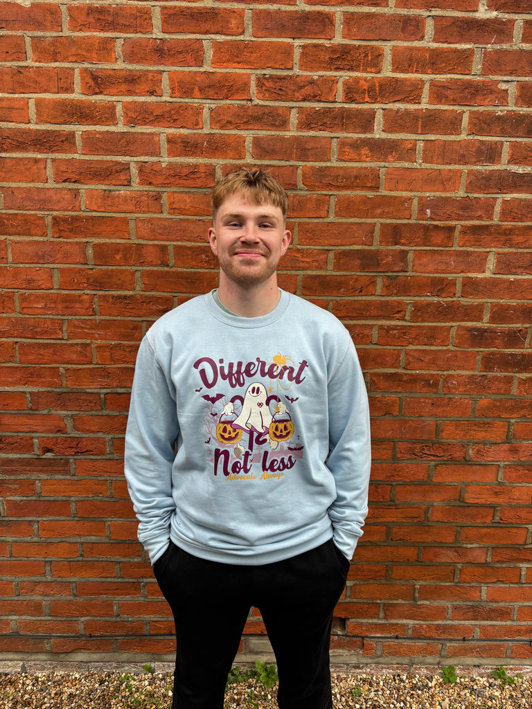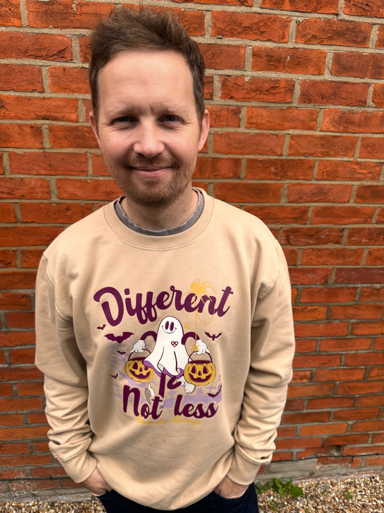 The Different Not Less Halloween Sweatshirt features a friendly ghost carrying two trick-or-treat pumpkin buckets, paired with our bold Different Not Less message. It’s a fun seasonal design that also reminds the world that being different is something to celebrate, not apologise for.