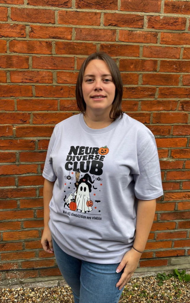 The Neurodiverse Club Halloween T-Shirt features a playful ghost in a witch’s hat alongside the words “Not all disabilities are visible”. More than just a Halloween tee, it’s a statement of inclusion and awareness that lasts long after the pumpkins are gone.