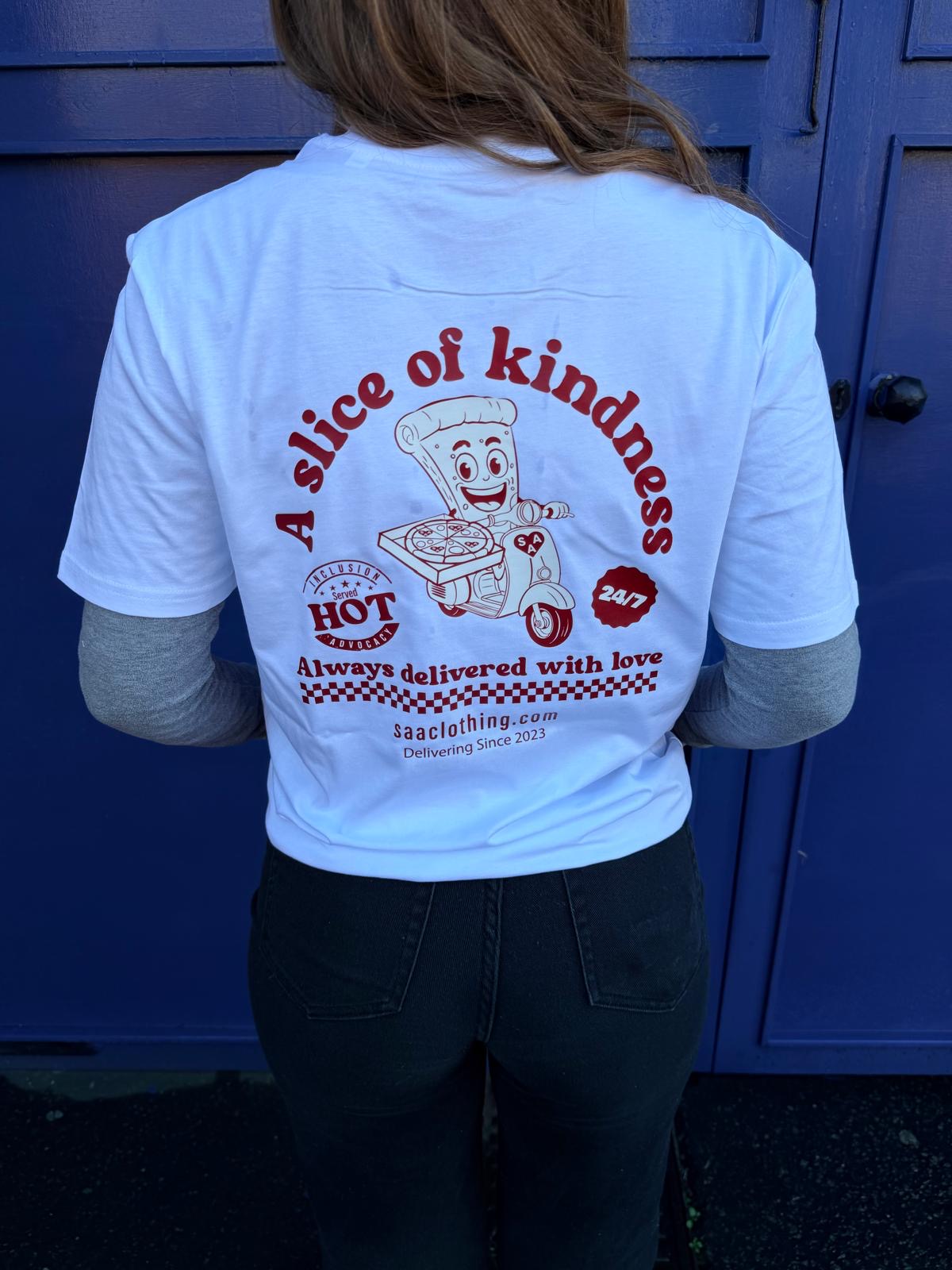 Our Slice of Kindness T-Shirt is all about spreading positivity wherever you go. Featuring our cheerful cartoon pizza slice riding an SAA scooter, with the message “A slice of kindness - always delivered with love”, this design is a reminder that small acts of kindness can make a big difference.